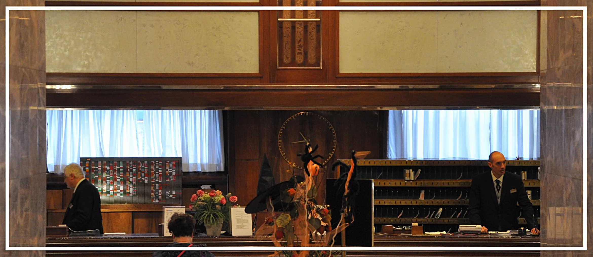 The lobby itself is decadent. Upon walking up a few steps and between the only two lifts (which I assume are not original, as they function quite well, and quickly), a wide seating area is presented, with a tasteful, handsome lounge directly to the right, and a well-sized meeting space to the left. There were further meeting spaces below which I did not explore, but I can assume they are of similar taste and design. Beautiful wood paneling adorns the walls, as well as maps and minimalist-style clocks. The seats themselves are plush and comfortable, if not a tad worn – but don’t let that deter you. Sitting in the lobby allows you to watch any number of tourists gathering in their masses, while some diligent group leader with shadows under his eyes and a flag in his hand tries to wrangle them together, not unlike a veteran sheep dog diligently tending to the herd.